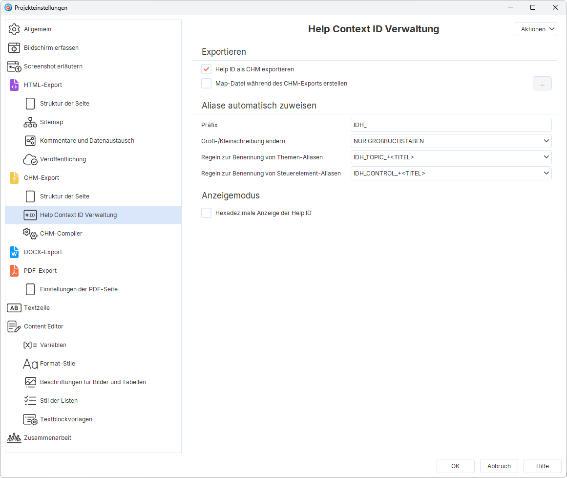 - Flexibilität bei der Integration. Sie vergeben die IDs selbst, was es ermöglicht, die Hilfe mit beliebigen UI-Elementen zu verknüpfen: Dialogen, Schaltflächen, Feldern.
