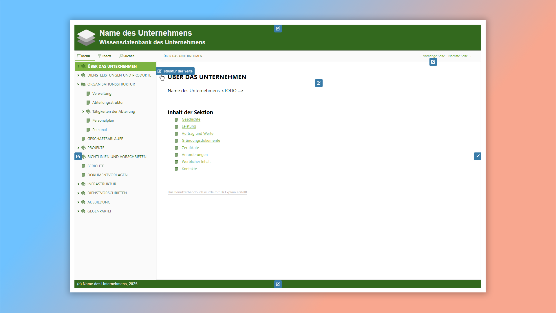 Nachfolgend wird der Prozess der Erstellung einer Web-Version Ihrer Benutzerdokumentation kurz beschrieben. Detaillierte Informationen dazu finden Sie im Benutzerhandbuch von Dr.Explain.