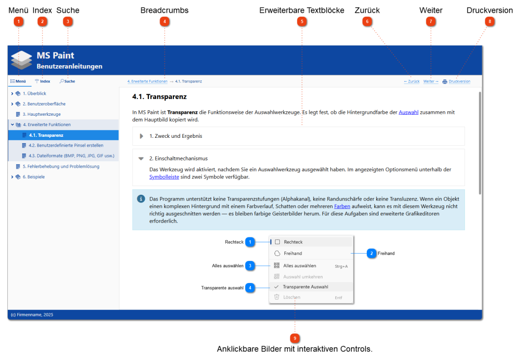Wenn Sie beispielsweise ein Online-Handbuch erstellen, müssen Sie Elemente wie Menüs, Pfeile zur nächsten oder vorherigen Seite, ein Suchfeld und so weiter nicht selbst entwickeln. Dr.Explain stattet die Hilfe automatisch mit diesen interaktiven Elementen aus. Sie können dem Inhalt auch HTML-Codeblöcke mit eigenen Elementen, Skripten oder externen Widgets hinzufügen.