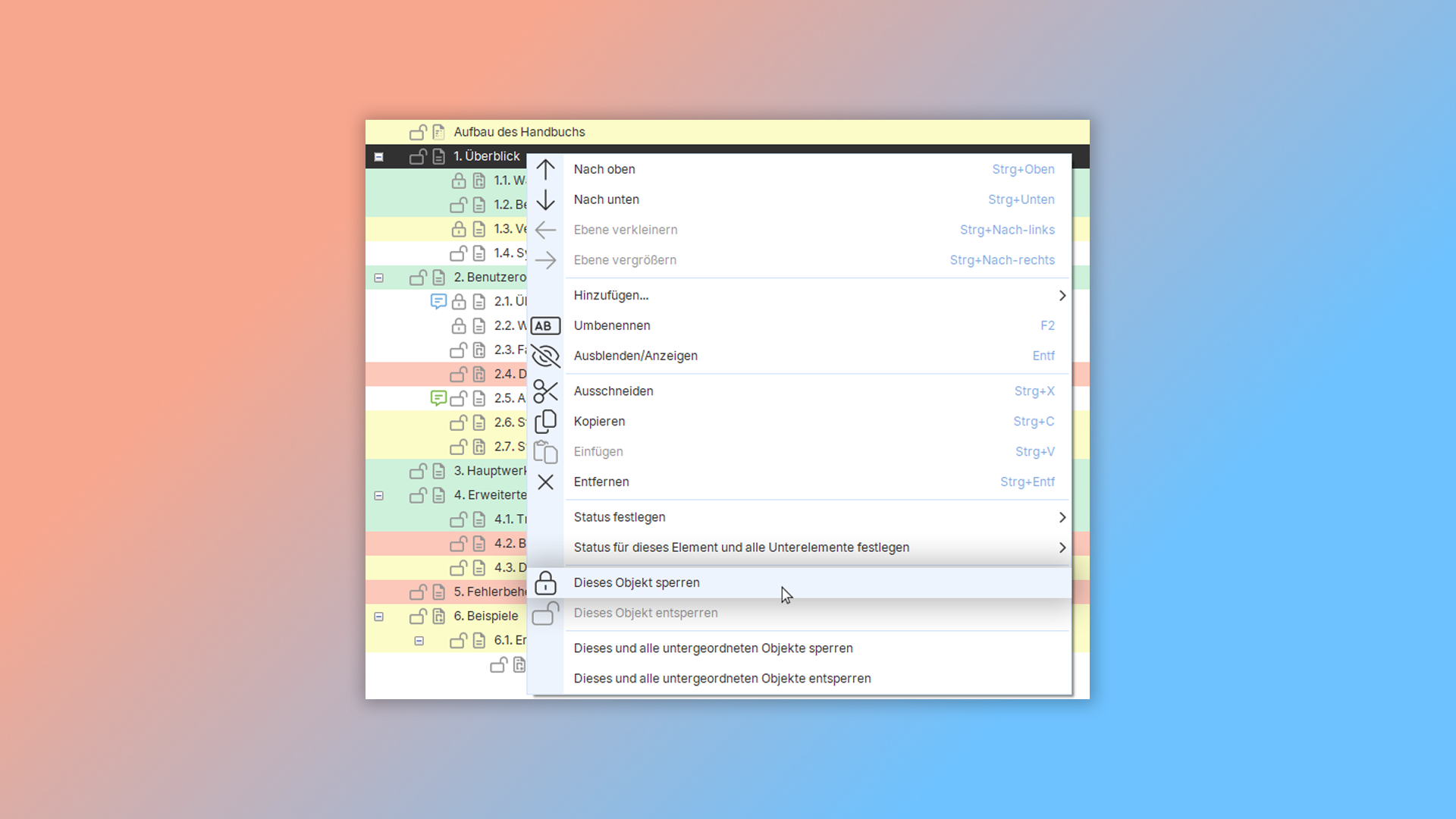 Um einen Abschnitt zu sperren, klicken Sie mit der rechten Maustaste darauf und wählen Sie den Befehl 'Sperren'. Derselbe Menüpunkt ermöglicht es Ihnen, den Abschnitt zusammen mit allen darin enthaltenen Unterabschnitten zu sperren.