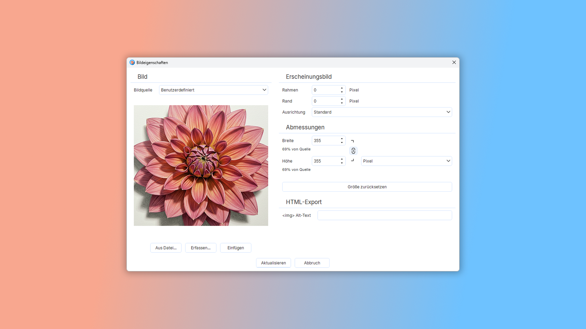 Flexible Bildkontrolle. Passen Sie die Bildgröße einfach an, fügen Sie Ränder und Rahmen hinzu und steuern Sie den Textumbruch. Sie können auch Alternativtexte (wichtig für Online-Hilfen) hinzufügen und die Ausrichtung anpassen.
