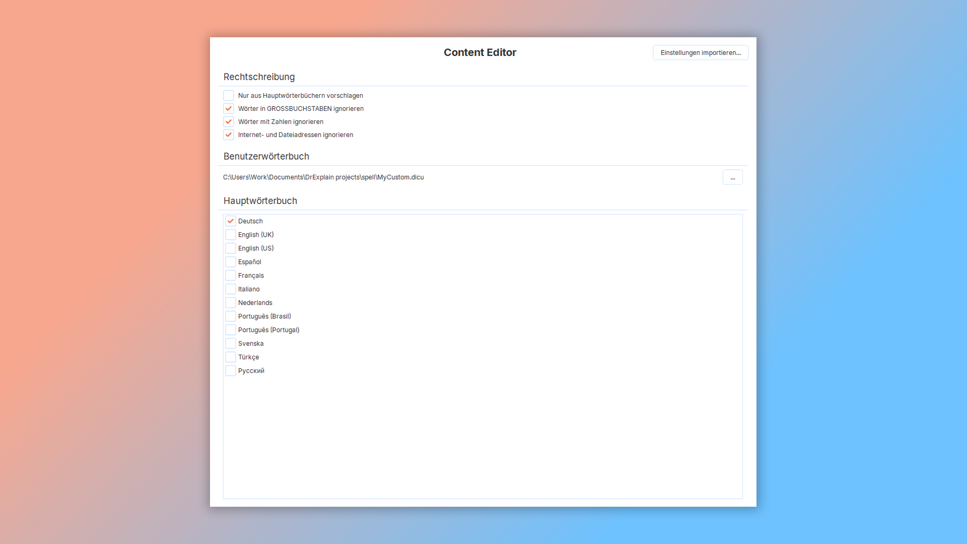 - Rechtschreibprüfungs-Einstellungen aus anderen Dr.Explain-Projekten zu importieren.